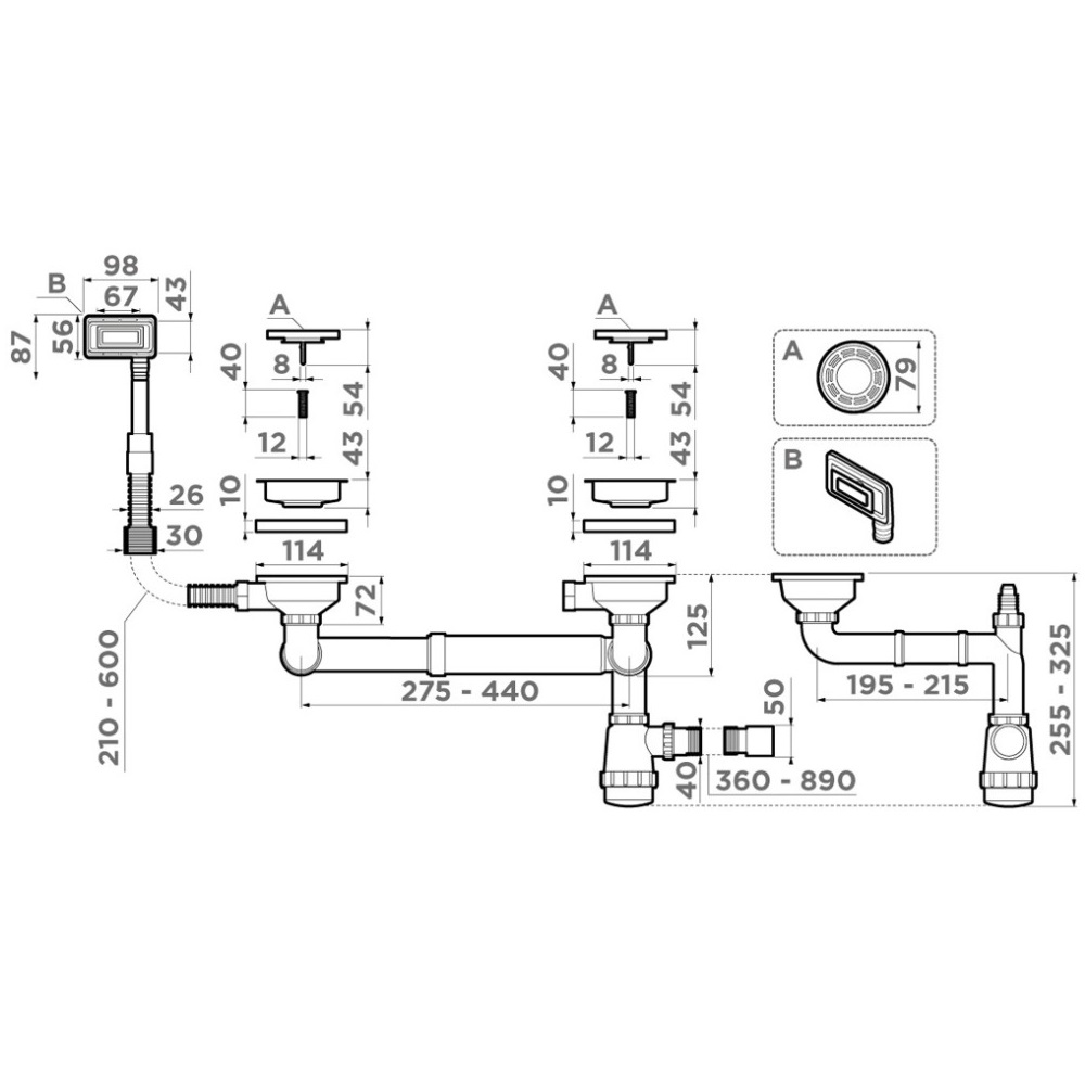 Арматура для полуторачашевых моек с универсальным прямоугольным переливом. Подходит для полуторачашевых моек Kata, Kitagawa.