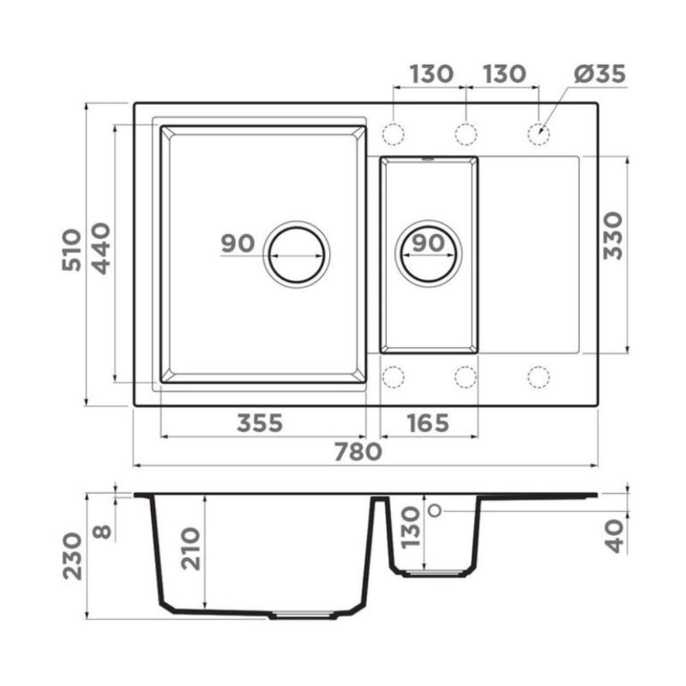 Мойка кухонная Omoikiri из коллекции Daisen 78-2T-EV имеет размеры 780х510 мм., изготовлена из искусственного гранита. Форма — прямоугольная, одна чаша без отверстия для смесителя. Сифон в комплекте. Ширина чаши 35,5. Врезной монтаж. Имеется дополнительная чаша.