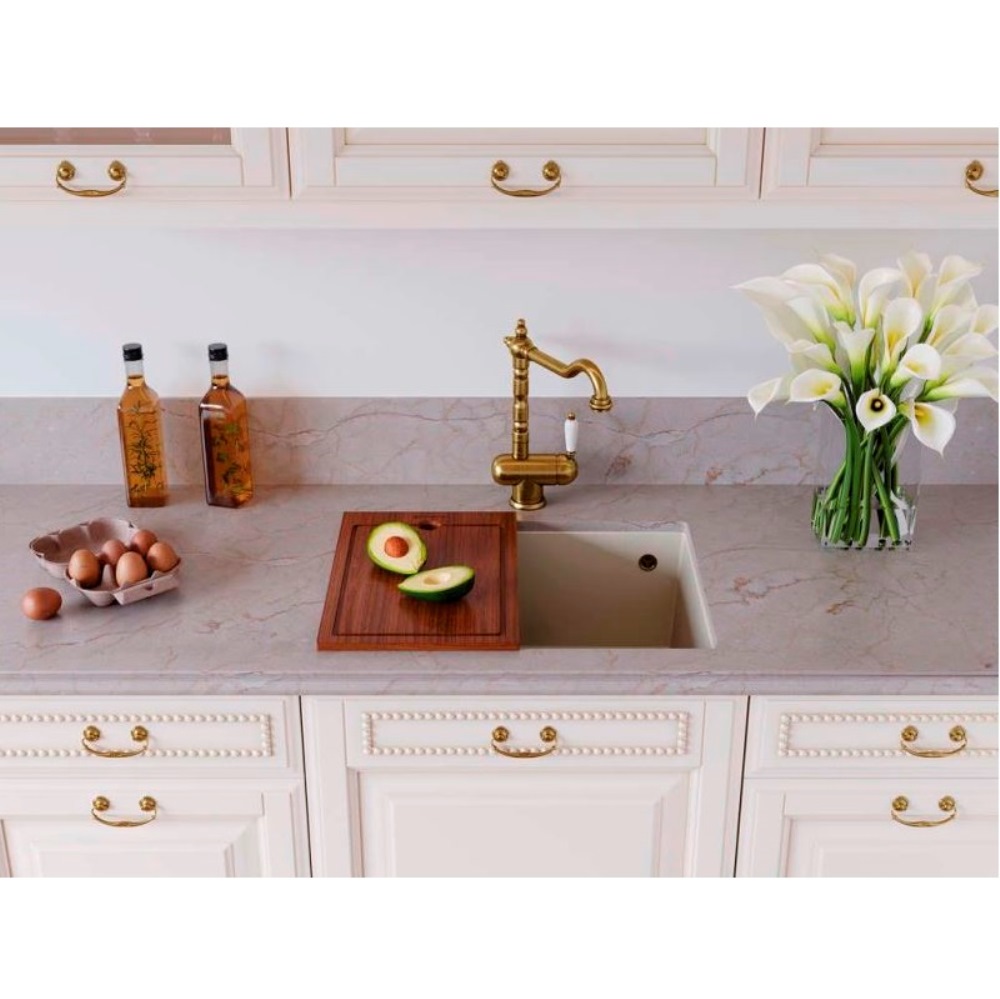 Мойка кухонная Omoikiri из коллекции Tedori 54-U-BE имеет размеры 550х420 мм., изготовлена из искусственного гранита. Форма — прямоугольная, одна чаша без отверстия для смесителя. Сифон в комплекте. Ширина чаши 51. Подстольный монтаж.