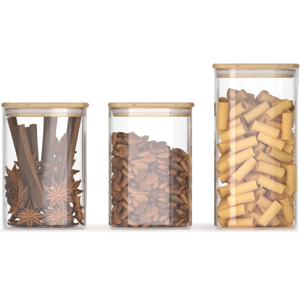 Корпус — стекло, крышка — бамбук. В комплекте 3 банки (1 — 1400 мл, 2 — по 1000 мл).