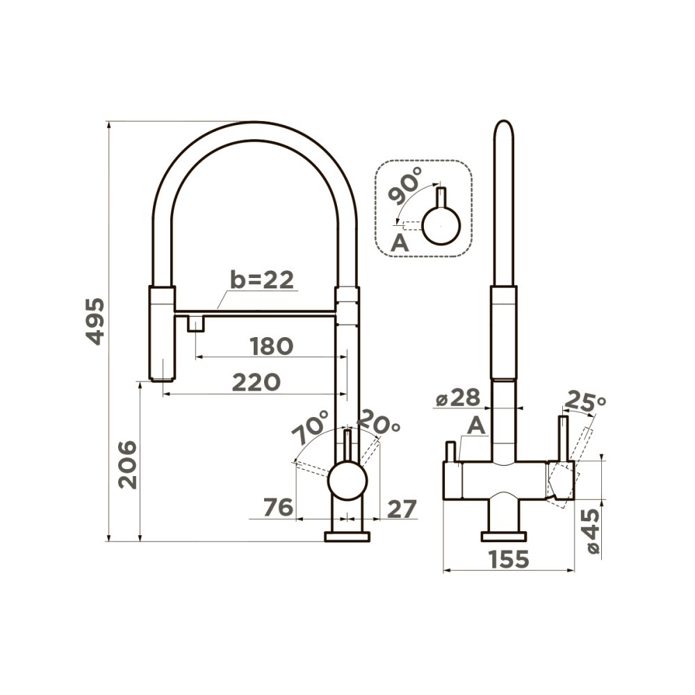 Смеситель для кухни Omoikiri Kanto с подключением фильтра оснащен рычажным управлением для регулировки температуры и напора воды. Горизонтальный монтаж на 1 отверстие. Гибкий излив 220 мм.