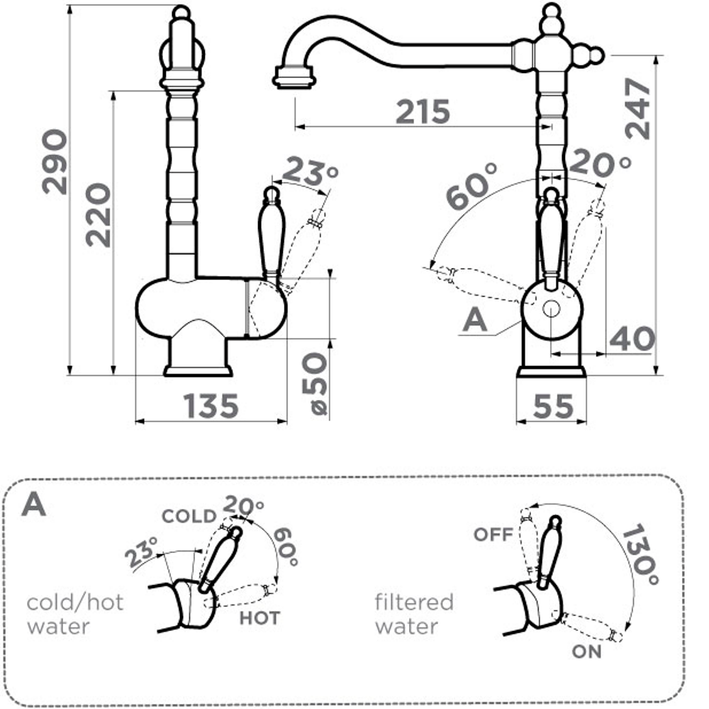 Смеситель для кухни Omoikiri Kyoto с подключением фильтра оснащен рычажным управлением для регулировки температуры и напора воды. Горизонтальный монтаж на 1 отверстие. Поворотный излив 215 мм.